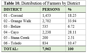 Furthermore, out of the total active farmers, the highest concentration of farmers is in Orange Walk (2,702) followed by Cayo (2,238) respectively. Orange Walk comprises the largest number of farmers in the entire country which adds up to 33.94% of cattle ranchers.