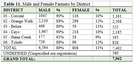The BLR female representation stands at 11% versus 89% males. The Toledo district consist of the highest female population by percentage at 12% versus Stann Creek district with a 9% female population (Table 11).