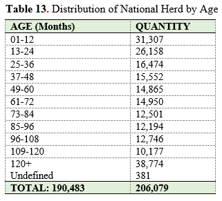 Table 13 shows the distribution of the National Herd by Age. This illustrates a healthy young cattle population with approximately 35.8% being less than 3 years old (i.e. 36 months). Total herd population within the BLR stands at 206,079 at the end of 2025, with 157,388 being female, 48,260 being male and 408 being castrated animals.