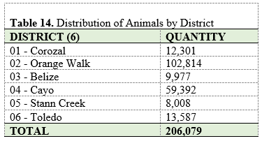 Table 14 shows the distribution of animals by district. Orange Walk has the highest concentration of cattle followed by Cayo. The northern two districts comprise 115,115 animals or 55.8% of all the animals within the country. This is followed by the Cayo district with 28.8% of the total cattle population.