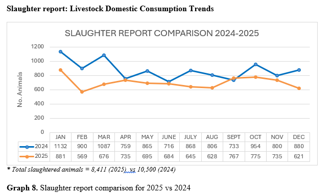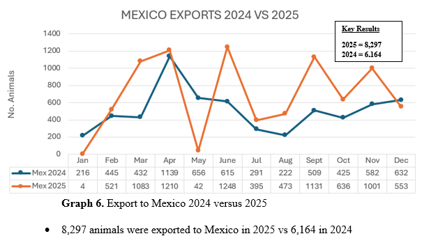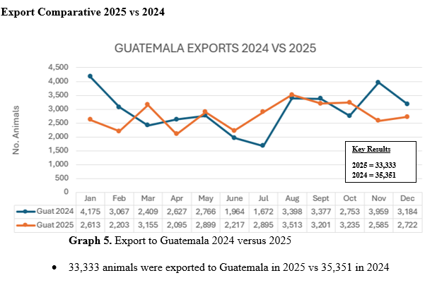 Total consolidated cattle export from Belize summed a total of 41,630 animals in 2025 of which 33,333 was exported to Guatemala and 8,297 was exported to Mexico by the end of December 2025. A comparative 2025 vs 2024 can be seen as follows.