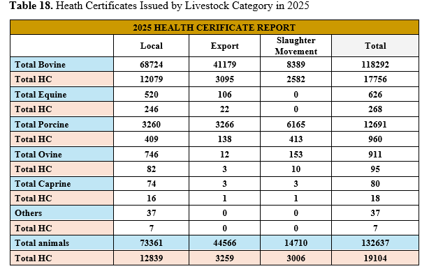 Health certificates were established as a new requirement for the movement of livestock following the emergence of the New World Screwworm. As a result, agents are required to inspect all livestock to ensure there are no open wounds or signs of screwworm infestation before issuing a health inspection certificate prior to any animal movement. The results of the accumulated health inspection certificates follow in table 18 and 19